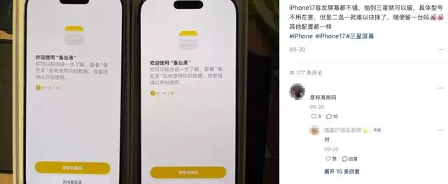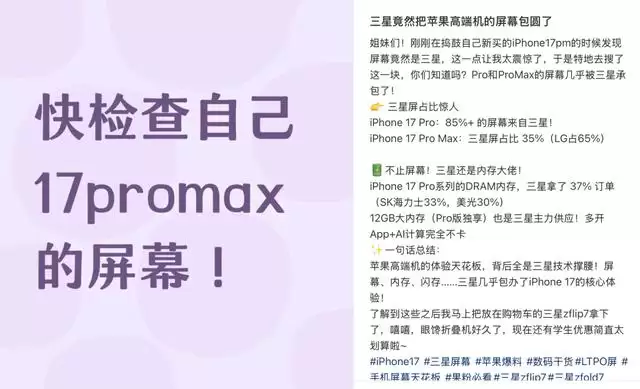 在最新的iPhone 17系列中,屏幕供应商为三星、LG、京东方三家,果粉们无不期待自己能抽中三星屏幕的手机。