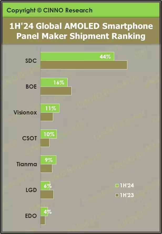 相关数据显示,2024年全球AMOLED手机屏幕市场份额情况,三星市场份额44%仍为全球第一,不过京东方的全球份额已占16%,离三星越来越近。