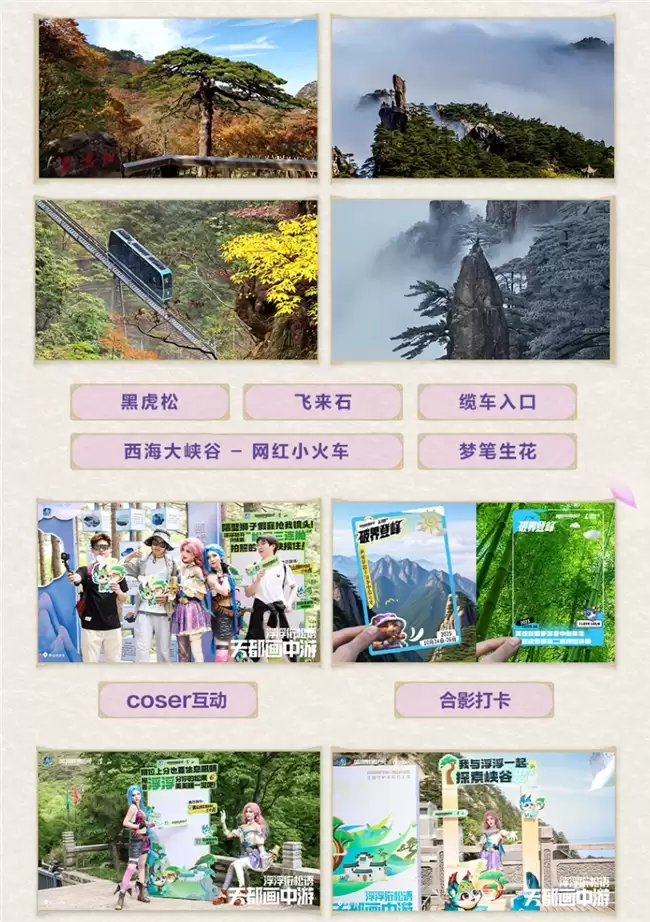 黄山的每一个角落都是打卡的绝佳选择。黑虎松、飞来石、缆车入口、西海大峡谷-网红小火车、梦笔生花等景点,都各具特色。你可以挑选手喜欢的景点,与Coser互动合影,留下珍贵的打卡照片。在这些点位,你不仅能欣赏到黄山的自然之美,还能感受到电竞文化与传统景点的巧妙融合,为你的嘉年华之旅增添更多乐趣。