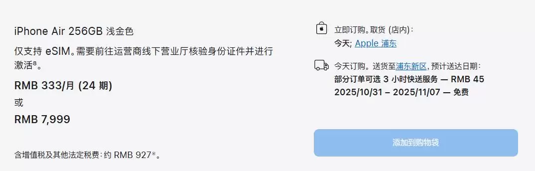 在延期近一周后,iPhone Air于10月22日正式登陆中国市场。此前由于eSIM技术的商用审批问题,这款新品未能在全球同步上市。