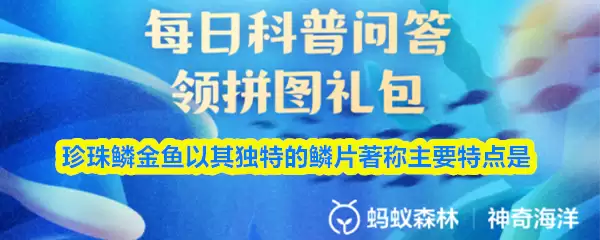 珍珠鳍金鱼因其独特的鳍片而闻名,它们最显著的特征是什么呢?【神奇海洋】10月23日的新题目已开放答题!正确答案正式公布,快来领取拼图,一同为修复海洋生态贡献力量吧!今日的正确答案就是:【鳍片呈珍珠状】。珍珠鳍金鱼正是因其身上布满如珍珠般美丽的鳍片而得名。