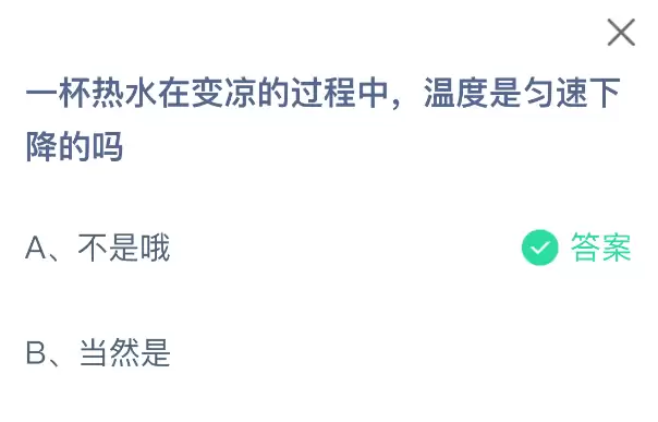 你知道吗?一杯热水在变凉的过程中,温度真的会匀速下降吗?支付宝小鸡课堂开课啦!每天花一分钟答题就能赚饲料,喂养小鸡还能贡献爱心哦!轻松又充满意义!2025年10月24日蚂蚁庄园的小鸡课堂题目正确答案是【不是哦】。热水在冷却过程中,水温其实是先快后慢地下降,而不是保持匀速。