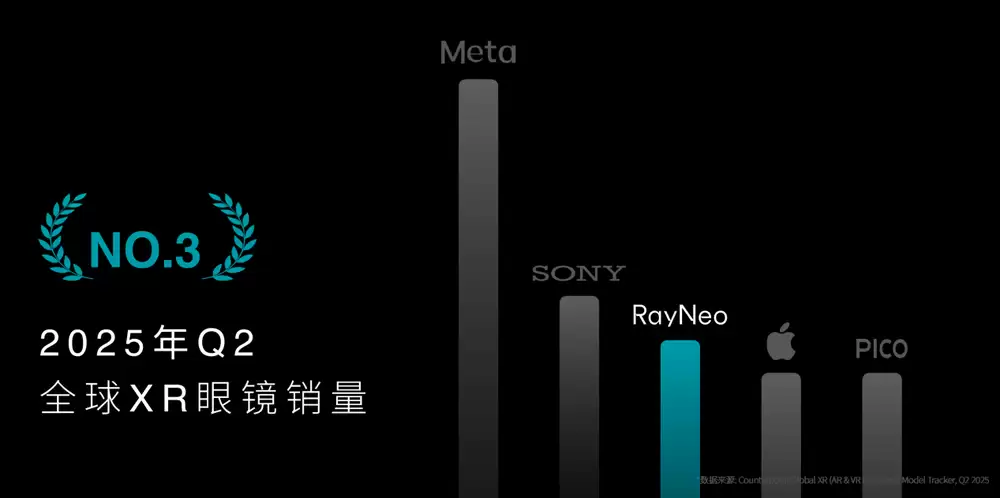 作为中国创新力量的代表,雷鸟创新凭借技术领先与市场占有率的双重优势,正引领全球消费级AR市场发展。根据第三方机构Counterpoint Research数据,2025年第二季度,雷鸟创新以高达39%的市场份额登顶全球AR眼镜销量榜首,甚至超越了苹果,成为全球XR市场(含VR头显和AR眼镜)第三名。