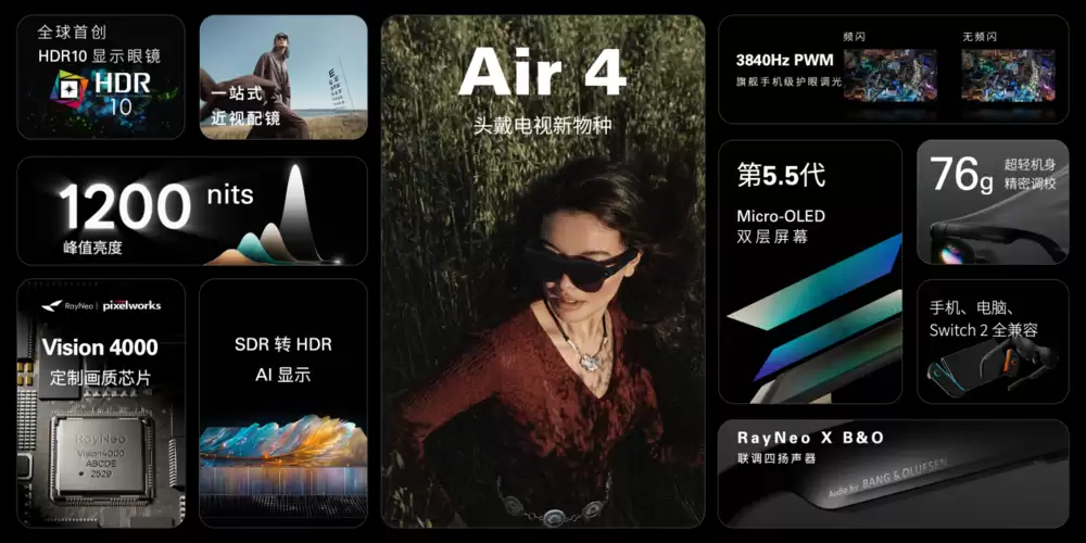 雷鸟 Air 4 系列是雷鸟创新将全球领先技术实力转化为大众消费产品的又一关键里程碑。雷鸟创新联合全球领先的画质芯片公司Pixelworks,打造全球首颗AR专用画质芯片“Vision 4000”,推动AR眼镜进入定制芯片时代,突破通用硬件局限,让芯片更适配穿戴显示场景,解决画质、音质与沉浸感难题。