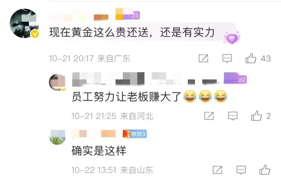 有内部员工透露,入职满3年的同事可以拿到约4克重的金戒指,入职5年的员工获赠11克重的金戒指,而那些在公司服务满十年的资深员工,则收到了重达100克的“金鸡”黄金摆件。一位员工在社交平台上感慨:“当前金价持续走高,公司仍然坚持发放黄金礼品,这份福利确实很有诚意。”