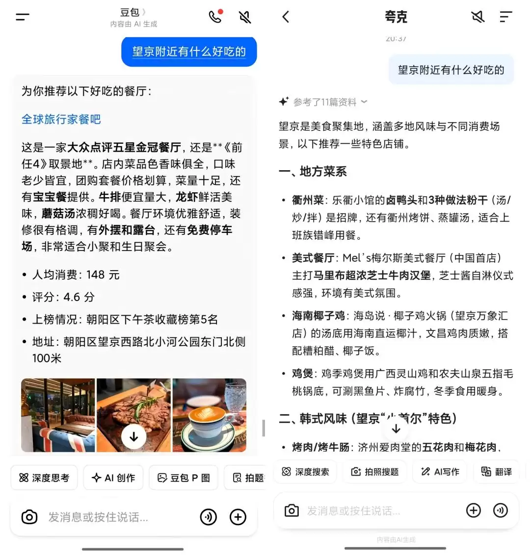 豆包继承了抖音强大的娱乐化功能和商业化基因,比如询问本地消费相关的问题时,豆包会直接给出具体的推荐,甚至能直接跳转到抖音团购界面,而夸克对话助手则是像工具APP一样给出分析,甚至给出每家餐厅的特点和推荐菜品。
