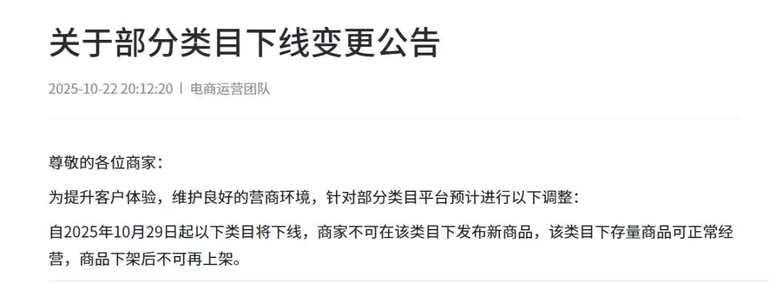 抖音电商运营团队于10月22日晚间发布《关于部分类目下线变更公告》,宣布自10月29日起,对以本地生活服务为主的近500个四级类目进行线下调整。