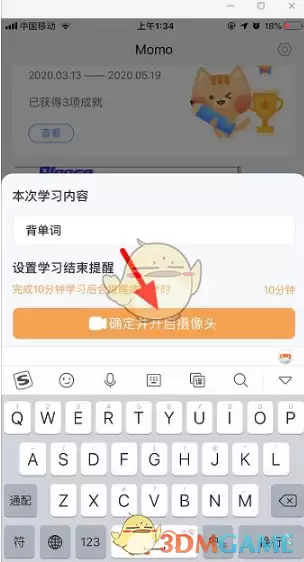 3、输入本次学习内容,例如"背单词",设置学习结束提醒,点击"确定并开启摄像头"。