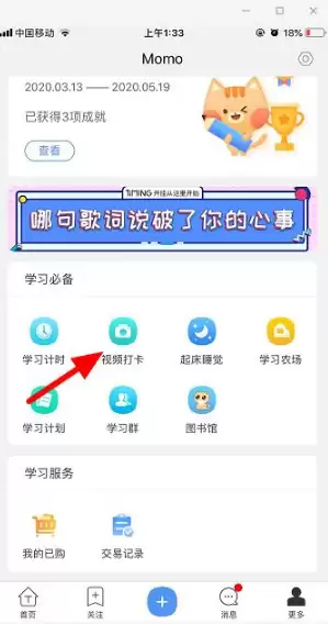 2、在功能列表中找到并点击"视频打卡"功能入口。