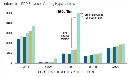 尤其值得注意的是甲骨文,其在最新披露的投资者文件中显示,公司仅从4家客户的7份合同中就获得了约650亿美元的增量RPO,推动其RPO总额一举突破5000亿美元大关。相较之下,谷歌与亚马逊的RPO规模则要小得多。