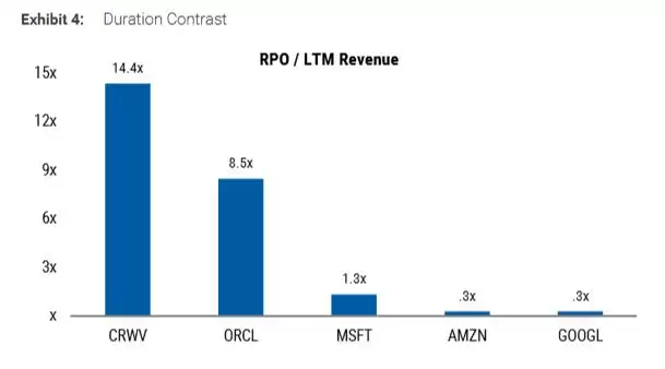 通过“RPO/过去12个月收入”这一比率,可以看出Coreweave和甲骨文的比率分别高达14.4倍和8.5倍。相比之下,微软仅为1.3倍,亚马逊和谷歌则约为0.3倍。