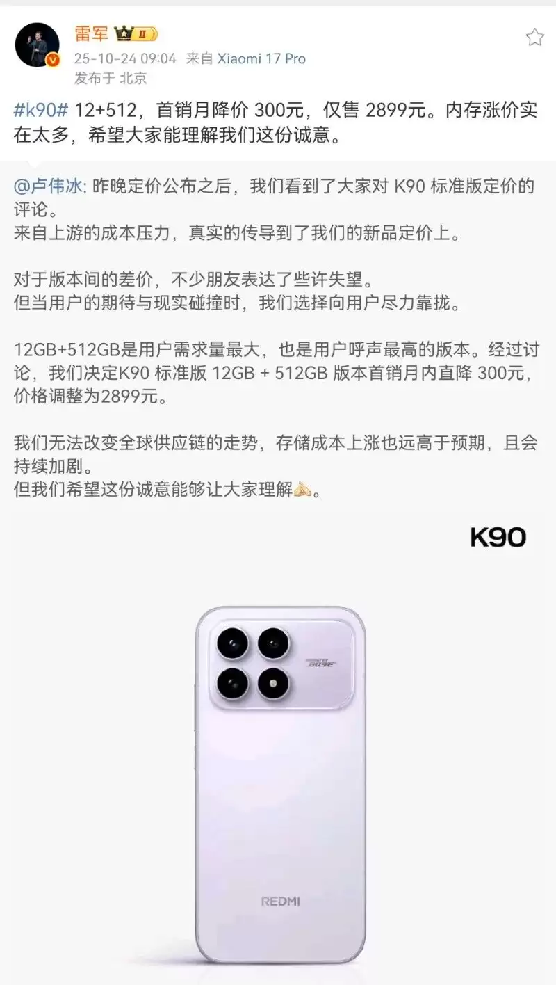 红米K90定价内存涨价,卢伟冰回应12GB+512GB首销月直降300元