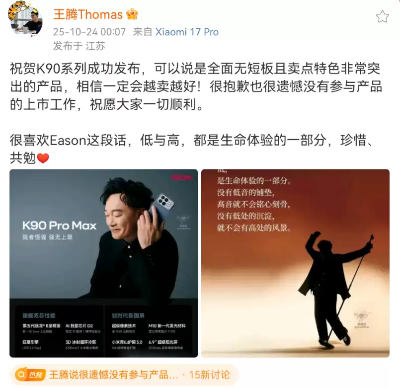 值得注意的是,王腾的微博账号自9月9日发布辟谣信息后长期处于静默状态,直至K90系列预热期才重新活跃。他不仅连续多日为新品宣传造势,更在发布会后点赞小米集团副总裁卢伟冰的总结微博,并留言"卢总辛苦了"。这种跨越个人职业变动的支持行为,令众多网友将K90系列视为王腾的"遗作",部分消费者直言"为支持王腾特地购买"。