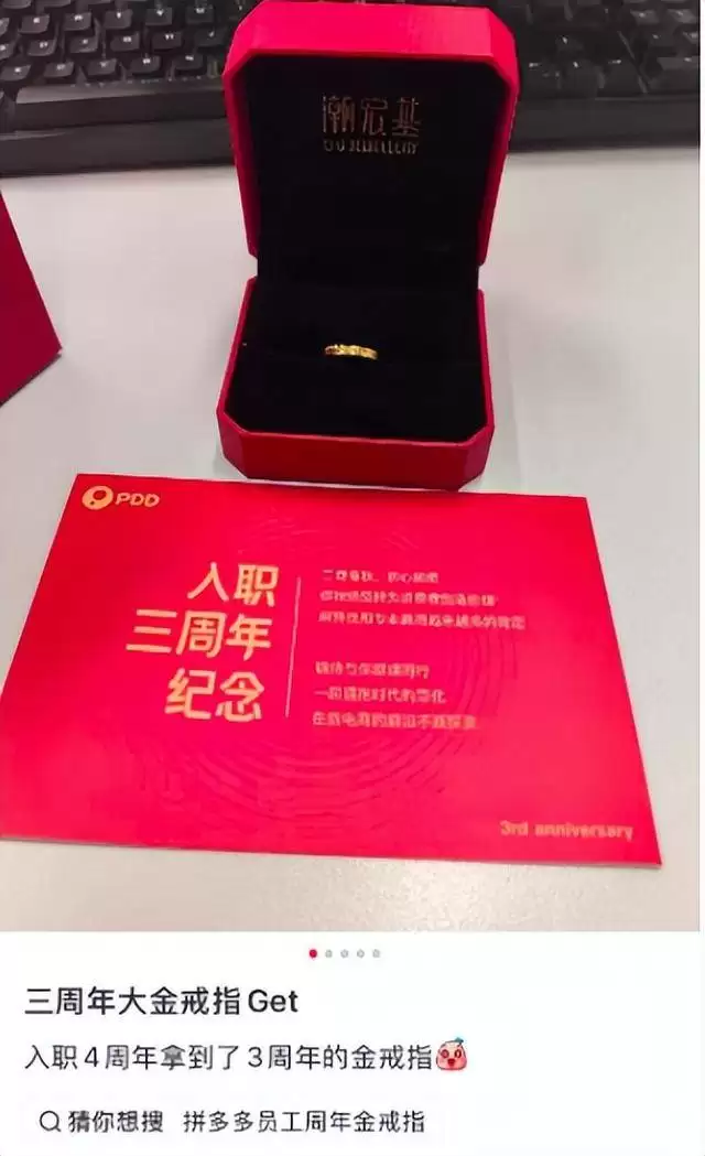 在拼多多十周年之际,公司为员工准备了一份特别的“周年礼”——一个红色方形礼盒,盒面印有“入职周年纪念”字样,打开后是一枚刻有员工姓名的黄金戒指。这一举动迅速引发网友热议,不少人感叹“这班没白上”“公