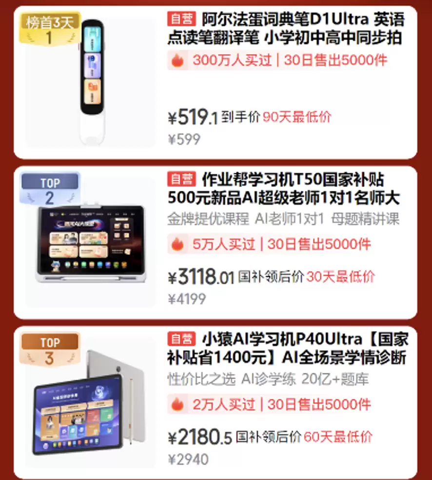 满足自己生活需求后,还在为孩子挑选学习设备发愁?AI学习硬件热销榜帮您解决难题!英语学习遇到瓶颈?可以选择已有300万用户正在使用的阿尔法蛋词典笔D1 Ultra,30日热销5千台,519.1元即可拥有点读翻译功能;想要请“AI私教”?作业帮学习机T50就是好帮手,30日销量突破5千台,5万用户已经入手,国补后到手价3118.01元,尊享1对1名师辅导;还有小猿AI学习机P40 Ultra,30日售出5千台,国补后2180.5元即可带回家。