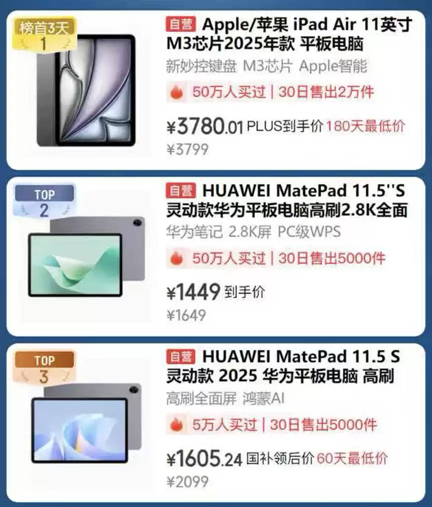居家使用之外,想要提升个人学习与办公效率?不妨关注AI平板热销榜中的精选设备。创意工作者可选iPad Air 11英寸M3芯片2025年款,作为50万人买过的榜首产品,30日热销2万台,180天内最低价仅3780.01元;同获50万用户选择的人气单品华为MatePad 11.5'S灵动款,平台补贴后1449元,2.8K屏带来沉浸式体验;值得入手的还有华为MatePad 11.5 S灵动款,30日已售5千台,国补后60天内最低价1605.24元,助力高效办公。