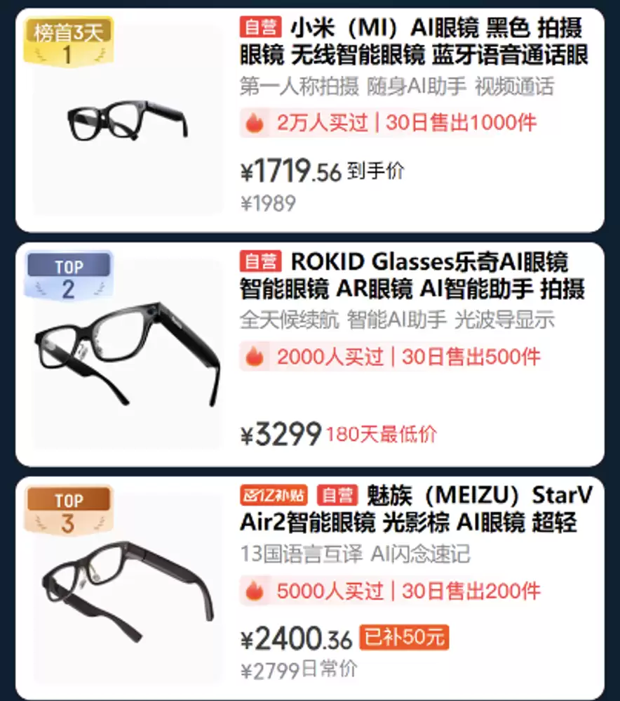 最后还有专为科技潮人准备的AI眼镜热销榜单惊喜体验:想要日常智能辅助?2万用户选择的小米AI眼镜黑色款值得考虑,蓝牙语音、视频通话都能轻松搞定,月销千台稳居榜首,到手价1719.56元;追求高端AR体验?那就选择2千用户正在使用的乐奇AI眼镜,30日销量500台,3299元享光波导显示与长续航功能;经常跨国旅行?让魅族StarV Air2智能眼镜帮您轻松互译13国语言,补贴50元后2400.36元即可入手。