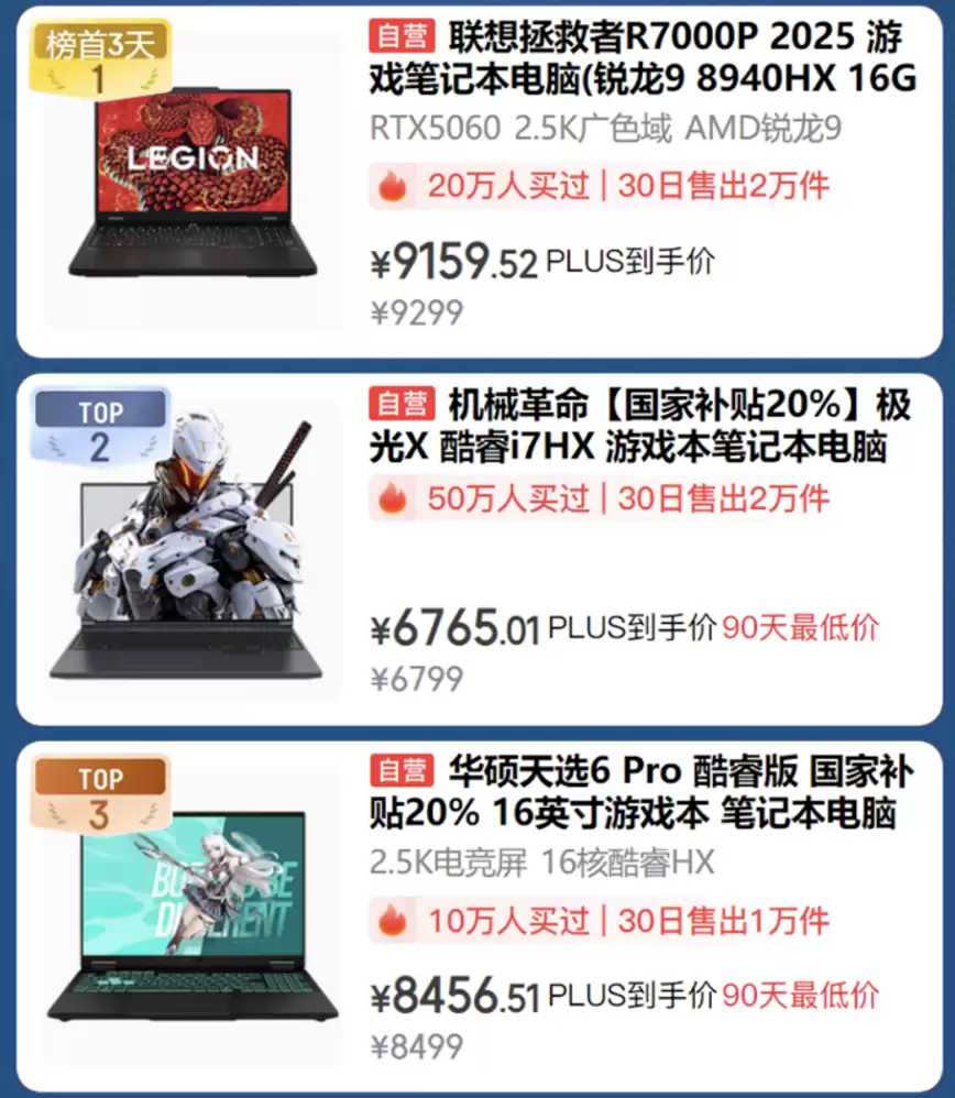 相较于手机,性能强劲的游戏本对玩家而言更是关键装备,AI电竞本热销榜已准备好您的采购助手。联想拯救者R7000P 2025游戏笔记本作为榜首产品,30日狂销2万台,PLUS会员到手价仅9159.52元;还有机械革命极光X 酷睿i7HX游戏本,50万用户选择后月销即达2万台,国补后PLUS会员价6765.01元,享90天最低价;偏爱颜值性能双在线?华硕天选6 Pro酷睿版笔记本就是不错的选择,10万用户的共同选择,国补后8456.51元即可拥有。