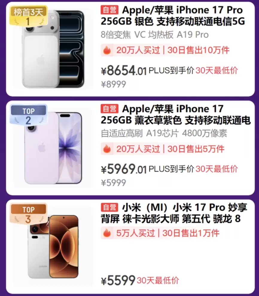 作为办公娱乐离不开的核心设备,手机的选择更要讲究,AI手机热销榜帮您精选3款优质产品。高端旗舰iPhone 17 Pro 256GB银色款已有20万人入手同款,月销量10万台,PLUS会员到手价8654.01元,30天最低价即可享受8倍变焦带来的专业拍摄体验;更有iPhone 17 256GB薰衣草紫色款,PLUS会员价5969.01元,A19芯片与4800万像素满足日常拍摄需求;还有这款深受5万用户青睐的小米17 Pro,30日内最低价5599元热销1万台。