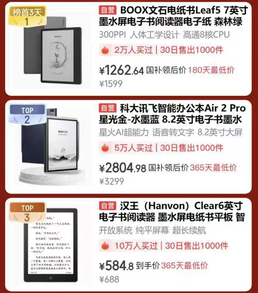 除了电子游戏,电纸书阅读也是休闲娱乐的好选择,AI电纸书热销榜为您推荐实用阅读工具。通勤阅读爱好者,榜首产品BOOX文石电纸书Leaf5森绿色款正合适,补贴后到手价1262.64元,7英寸墨水屏带来沉浸式体验;商务人士可选科大讯飞智能办公本Air 2 Pro,8.2英寸屏幕支持分屏与手写功能,30日已售千台,365天最低价享国补,低至5204.98元;学生群体可选汉王Clear6英寸电子书阅读器,30日售出千台,到手价674.8元即可开启超长续航阅读之旅。