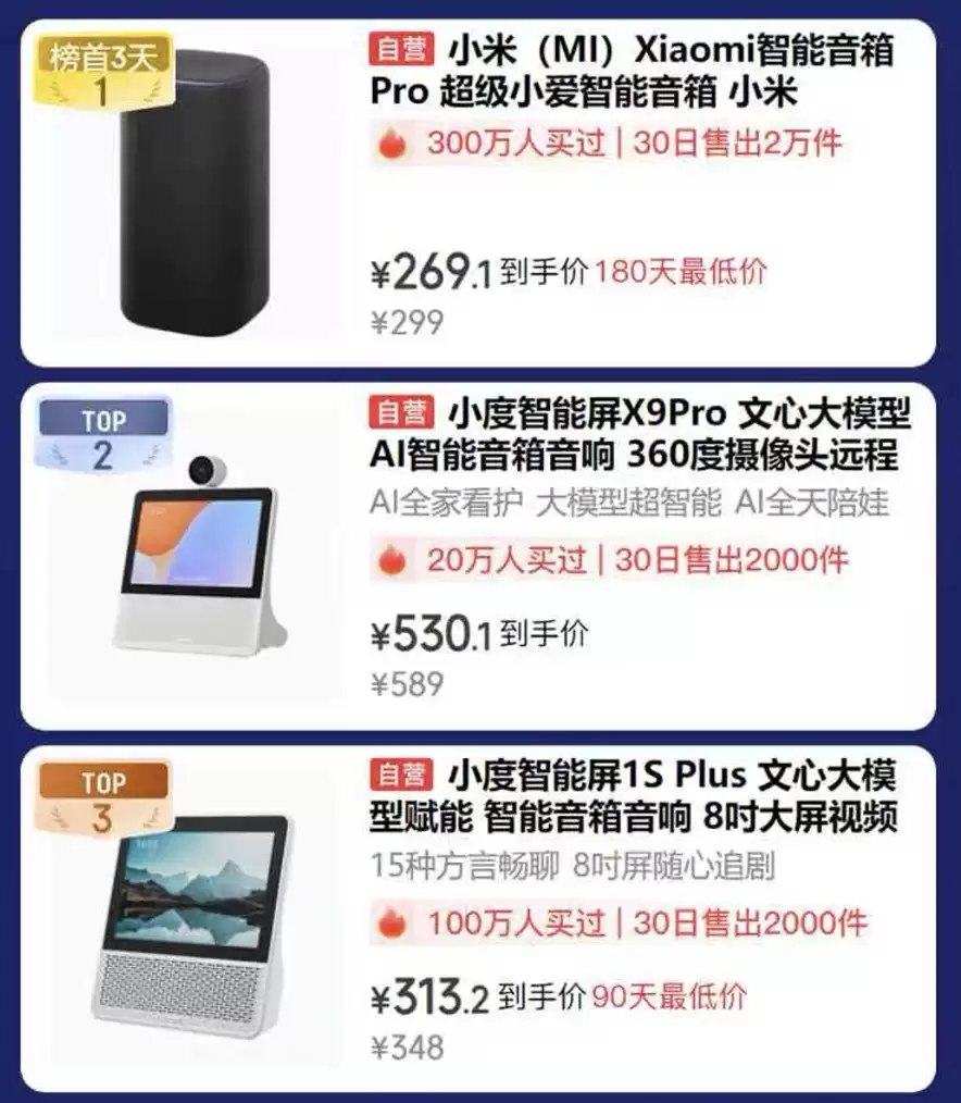 打造智慧生活,不妨从选择一款智能音箱开始!AI音箱热销榜为您推荐的家庭智能交互好物,榜首小米智能音箱Pro已获300万用户青睐,30日内热销2万台,当前优惠价低至269.1元;深受20万用户喜爱的小度添添X9 Pro特别适合有娃家庭,月销超2000台,530.1元即可享受360度远程看护与AI闲聊功能;喜欢追剧娱乐和方言互动?小度智能屏1S+ Plus与您需求完美契合,百万用户选择了这款产品,30日售出2000台,90天内最低仅需313.2元。
