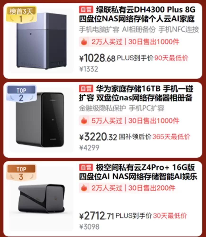 除了日常使用的好物,确保数据存储安全的产品也是很多家庭的刚需,AI家庭存储热销榜已备好选购指南。稳居榜单前三的绿联私有云DH4300+已获2万用户选择,30日即售千台,PLUS会员价1028.68元;追求隐私保护,5万用户青睐的华为家庭存储16TB正合适,国补后到手价3220.32元;科技爱好者可选极空间私有云Z4 Pro+,PLUS会员价2712.71元,与2万购买者共享同款智能娱乐存储体验。