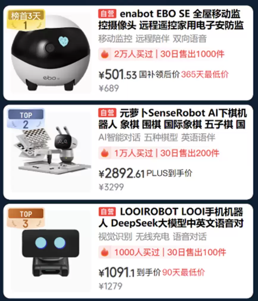 基础交互需求满足后,AI机器人热销榜单帮您把居家安全与趣味陪伴一并安排。榜单首位的enabot EBO SE全屋移动摄像头,已成为2万用户首选,30日销量破千,补贴后到手价仅501.53元,轻松实现亲友间的远程互动;位列第二的元萝卜AI下棋机器人,支持五种棋类对战与智能对话,月销200台,PLUS会员到手价2892.61元;科技爱好者不容错过的LOOI手机机器人,千人选购的热门单品,90天内最低价1091.1元,DeepSeek大模型语音对话与无线充电功能让您的生活更智能。