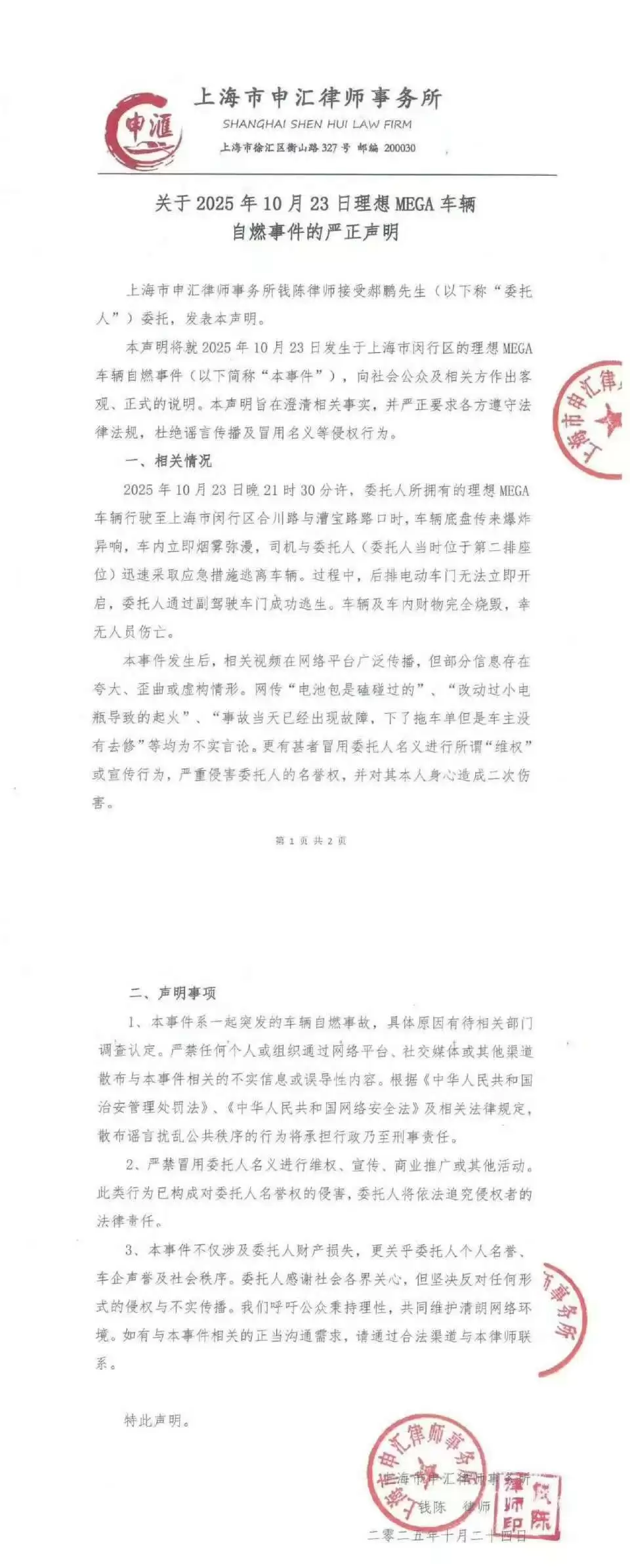10月24日消息,针对昨晚一辆理想MEGA在行驶途中突然起火的事件,委托方律师发表正式声明:2025年10月23日晚21时30分许,委托人拥有的理想MEGA车辆行驶至上海市闵行区合川路与绥宝路路口时,车辆底盘突然传来爆炸异响,车内立即烟雾弥漫。司机与委托人(当时位于第二排座位)迅速采取应急措施撤离车辆。