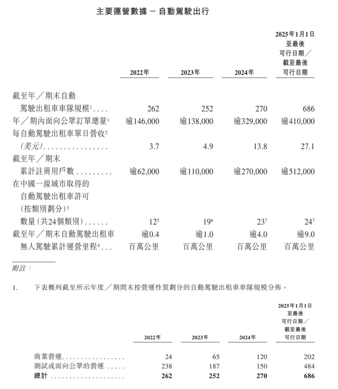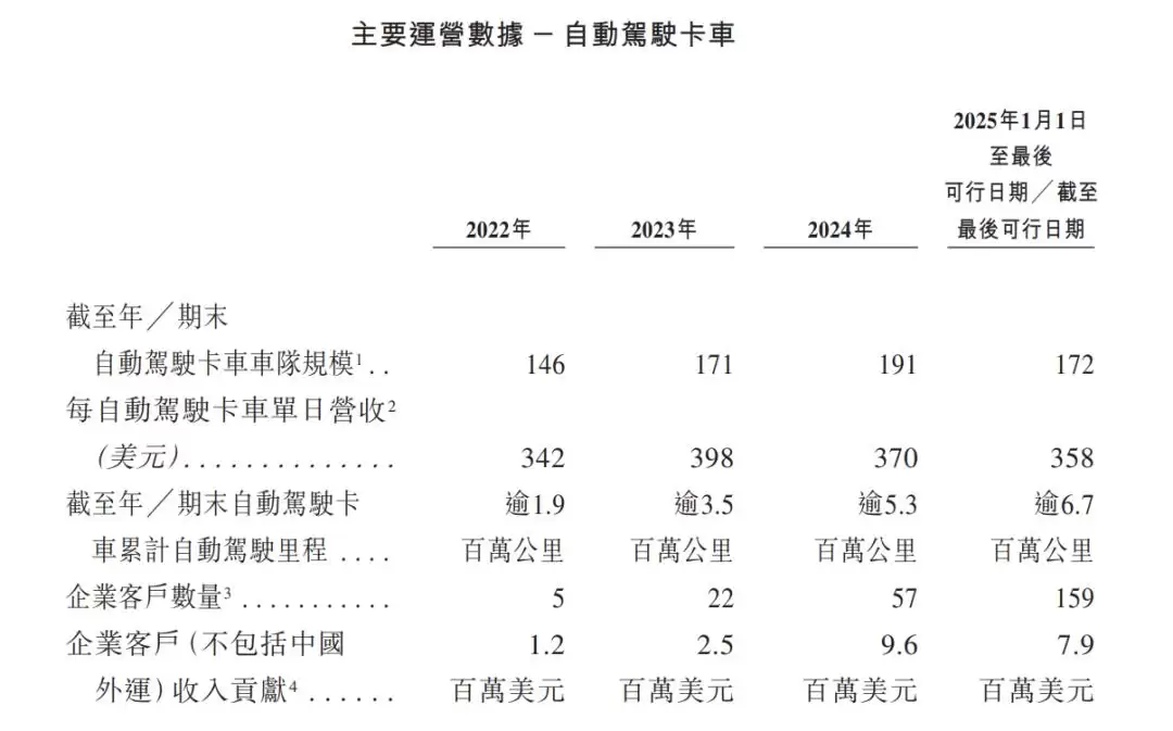 从经营数据看,两家公司想要重点表达的方向也截然不同。小马智行的披露极为细致:不仅拆分Robotaxi与卡车的车队规模、单车日均营收、累计无人化里程,还细化至自营与第三方租赁比例、商务与测试车辆数量等。
