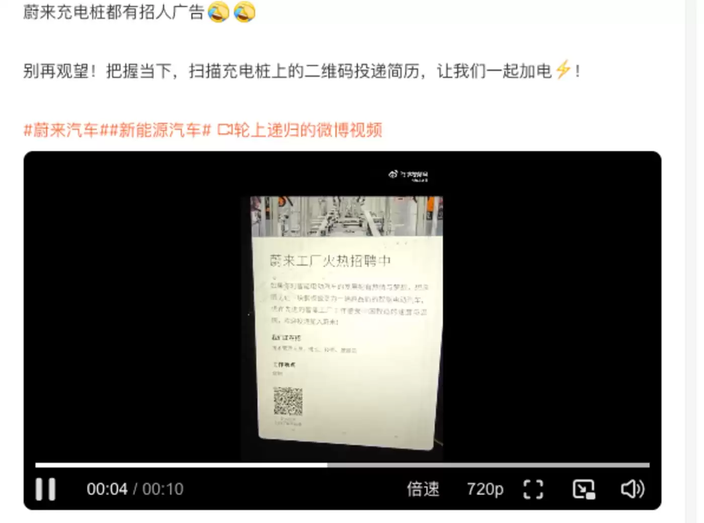 近期,一份群聊记录也显示,蔚来合肥工厂正在紧锣密鼓地进行招聘。甚至出现办公室坐不下,需要去食糖以及室内篮球场里进行上百人群面招聘的场面。有用户在社交媒体上分享,蔚来充电桩上都出现了工厂火热招聘的信息。