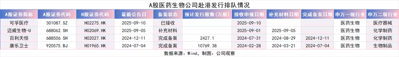当前,A股医药生物公司正掀起赴港上市热潮。Wind数据显示,百利天恒、康乐卫士日前已完成备案,前者近日通过了港交所主板上市聆讯;可孚医疗、迈威生物也在流程推进当中。此外, 贝达药业、长春高新、欧林生物均已宣布启动H股上市相关筹备工作。