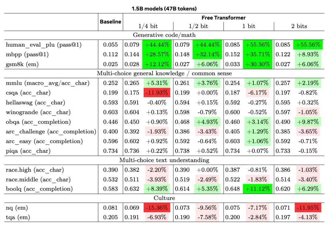 第三种架构名为自由变换器,简化了这一过程。它直接在模型中间层注入随机状态,而非使用独立的完整编码器。在训练过程中,编码器仍被使用一次,以帮助模型学会如何选取良好的隐藏状态,但它仅与网络的一部分协同工作。