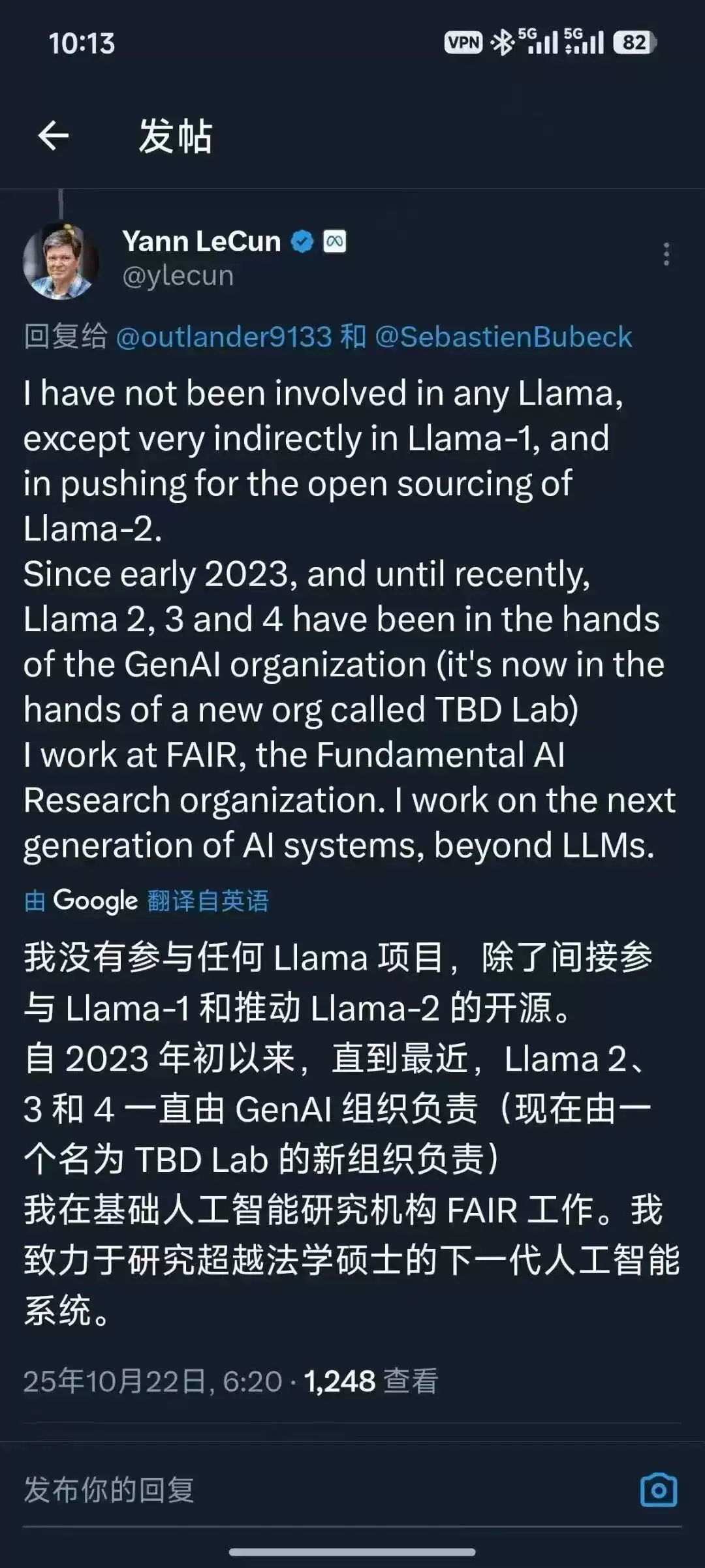 "我没有参与任何Llama项目,一直由其他团队负责,我主要是研究超越大语言模型的下一代人工智能。"