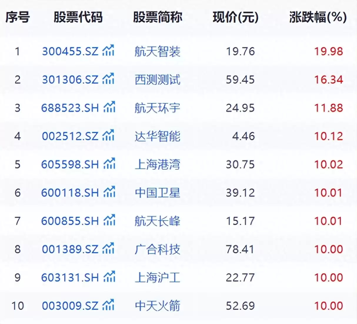 受此利好消息提振,商业航天板块今日强势爆发。截至收盘,航天智装(300455.SZ)、达华智能(002512.SZ)、上海港湾(605598.SH)、中国卫星(600118.SH)、航天长峰(600855.SH)、广合科技(001389.SZ)、上海沪工(603131.SH)、中天火箭(003009.SZ)、国机精工(002046.SZ)、东珠生态(603359.SH)等十余只商业航天概念股集体涨停。