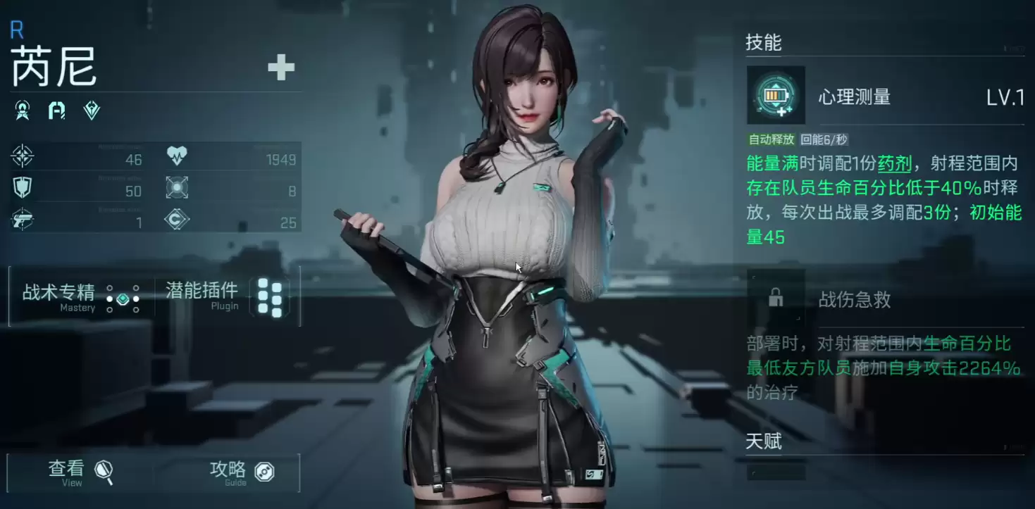 她的核心战斗技能"心理测量"会在能量蓄满后自动调配药剂,对射程范围内所有友方单位实施一次群体治疗。需要注意的是,该技能仅在当前队列存在生命值低于40%的成员时才会触发,这种设定既体现了策略性,也保障了治疗资源的合理分配。
