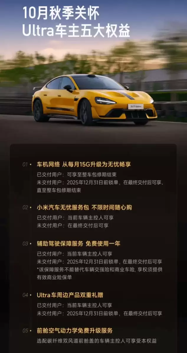 近日,小米汽车为其SU7 Ultra车型推出了“秋季关怀”专项权益计划,为已交付与未交付用户提供涵盖网络服务、无忧保障、辅助驾驶、周边礼赠以及空气动力学升级在内的五大权益,覆盖车辆全生命周期。