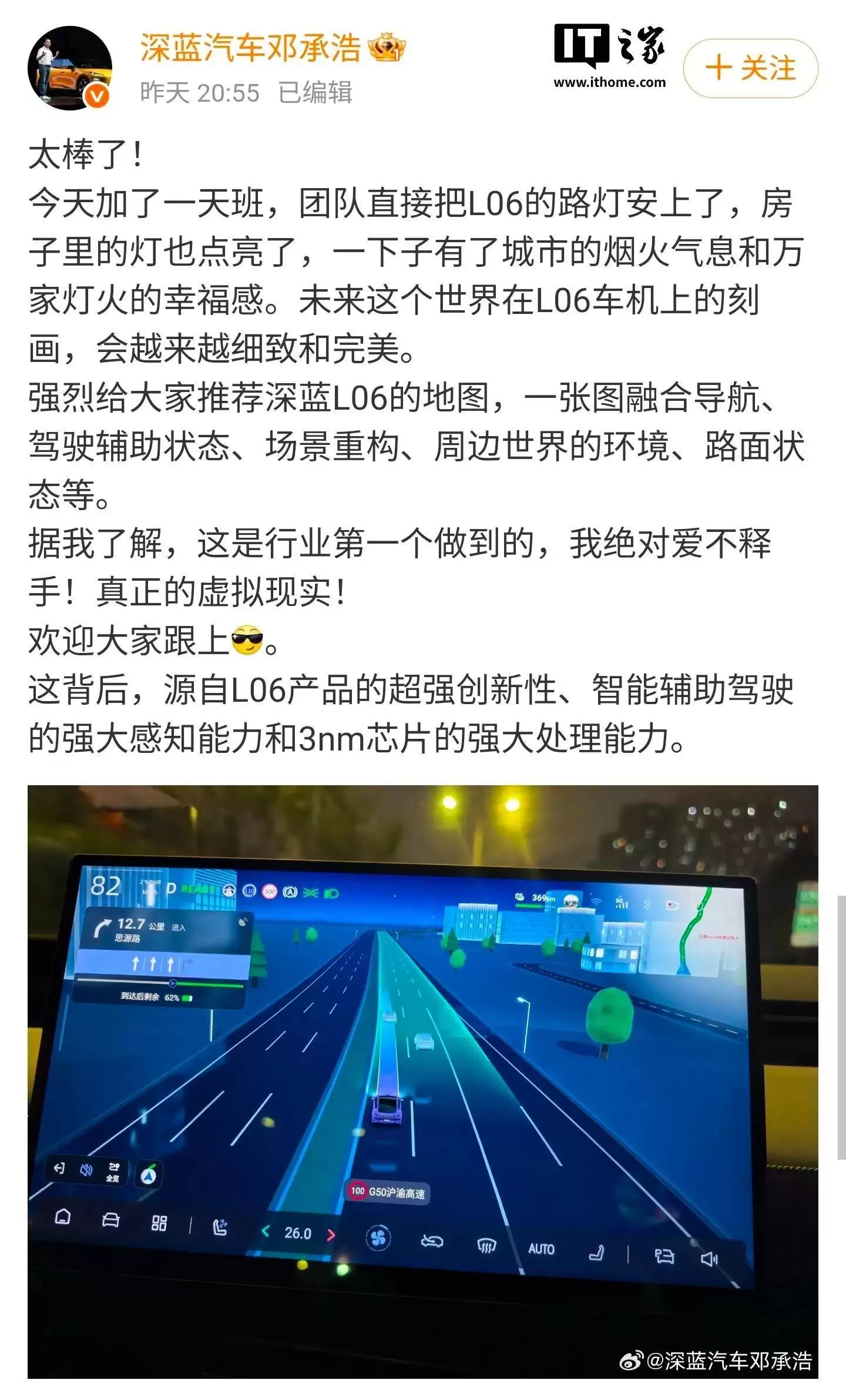 在技术配置方面,深蓝L06全系标配激光雷达与智能辅助驾驶系统,使其成为同级车型中的亮点。更引人注目的是其车机系统——董事长邓承浩透露,新车搭载的地图功能创新实现了导航信息、驾驶辅助状态、场景重构、周边环境感知及路面状况等多维度数据的融合显示,这在行业内尚属首次突破。
