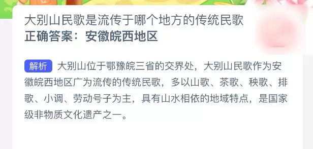 大别山民歌是流行于哪个地区的传统民歌?【蚂蚁新村每日一题】2025年10月26日题目已发布!坚持答题,累积木兰币,即可加速小镇建设。答对本题,立即可享“产速+3/时”的加速奖励!今天正确答案是【安徽皖西地区】。大别山位于鄂豫皖三省的交界处,大别山民歌作为安徽皖西地区广为流传的传统民歌。