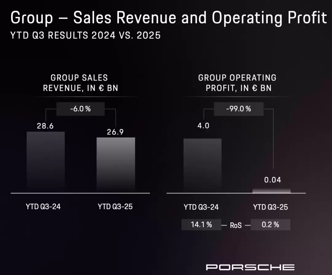 受第三季度业绩拖累,保时捷今年前三季度销售利润仅为4000万欧元,与去年同期的40.35亿欧元相比暴跌了99%。