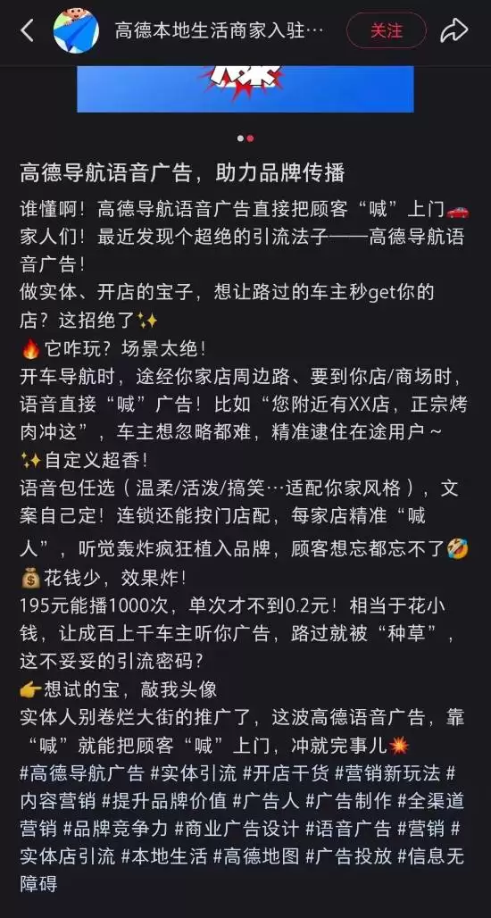 值得一提的是,一个名为"高德本地生活商家入推广运营获客"的账号,曾发文宣传"高德导航语音广告直接把顾客‘喊上门’"。