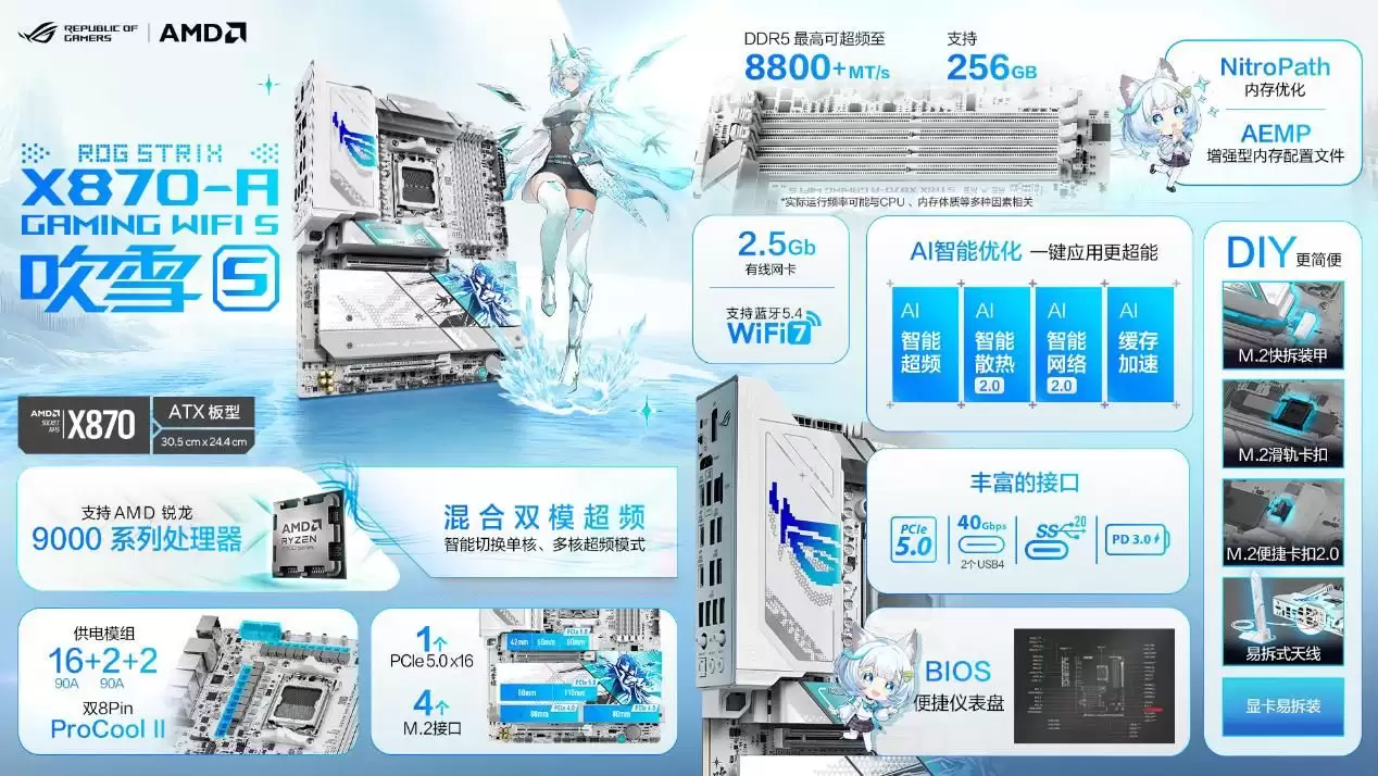 华硕ROG X870吹雪S主板采用16(90A)+2(90A)+2相供电模组,搭配双8Pin ProCool II高强度供电接口与一体化VRM散热装甲,可充分释放AMD锐龙9000系列处理器的全部潜力。板载4根内存插槽,配合NitroPath内存优化技术与AEMP(华硕增强型内存配置文件),最高支持DDR5 8800+(OC)频率。主板支持AI智能超频及混合双模超频技术,在确保系统稳定的前提下最大化压榨CPU性能。同时加入三档性能调节(PBO增强)功能,一键解锁温度墙限制,让处理器持续保持高性能输出。更搭载AI缓存加速引擎,开启后可显著提升AI运算效能。全面优化Token推理速度与模型微调(fine-tuning)效果,赋能本地化AI应用高效运行。配备4个M.2接口,其中2个支持PCIe 5.0协议。所有接口均覆盖高效散热片,显著降低固态硬盘工作温度,保障高速运行与游戏加载流畅度。还配备M.2快拆装甲、M.2便捷卡扣2.0和M.2滑轨卡扣设计,轻松安装不同尺寸的SSD。板载双USB4接口,理论传输速率可达40Gbps。另有USB Type-C接口支持30W PD快充,方便玩家在游戏时为手机、平板等移动设备快速补充电量。还搭载2.5Gb有线网卡和WiFi7无线网络,结合雪武战姬主题的银白色易拆式天线,简化安装步骤,为用户带来更快速、更稳定的网络环境。再加入AI智能网络2.0技术,软硬结合,畅享疾速网络体验。支持BIOS便捷仪表盘,搭配BIOS FlashBack一键升级和清除CMOS按键,进一步提升装机便利性。主板配备3个第二代可编程ARGB灯效接针,不仅能与其他ROG白色配件打造全家桶光效,搭配其他配色硬件也依然酷炫。更有雪武战姬形象出镜助阵,潮玩竞装,满血战力全开!