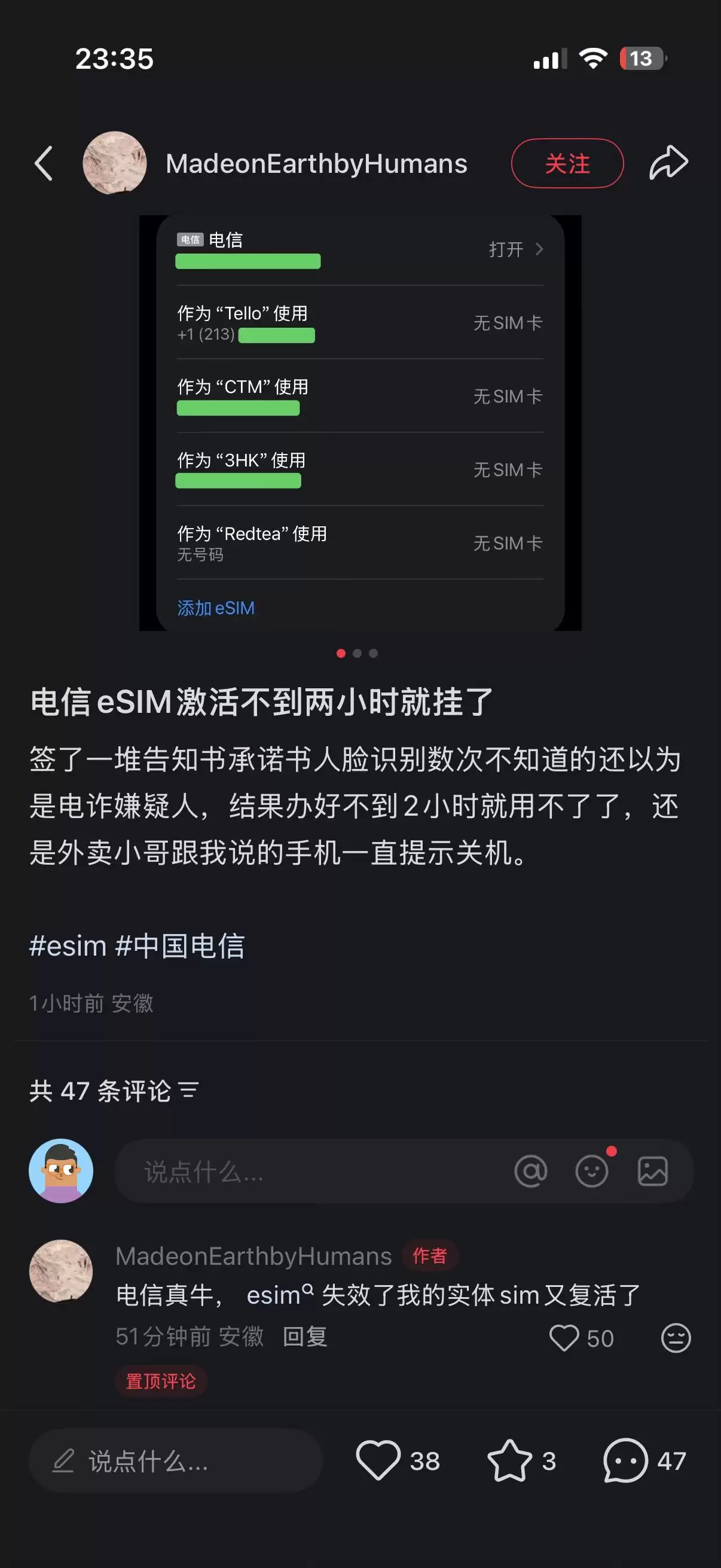 eSIM在国内的使用方式也比人们想象中更为"保守"。以国行iPhone Air为例:更换设备时,国内eSIM用户无法像海外用户那样一键转移,必须再跑一次营业厅;部分小红书用户更是反映自己的eSIM会"无缘无故失效",刚用两天就不得不折返营业厅重新办理。