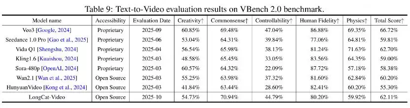 参数规模方面,LongCat-Video基座模型达到约136亿参数。评估体系全面覆盖文本对齐、图像对齐、视觉质量、运动质量与整体质量等维度;团队强调其在文本对齐与运动连贯性等关键指标上表现优异,并在公开基准VBench等测试中取得领先成绩。