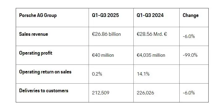 保时捷刚刚交出一份令人心寒的财报:2025年前九个月,集团营业利润从去年同期约40亿欧元断崖式坠落至区区4000万欧元——缩水幅度高达99%,近乎百倍差距。