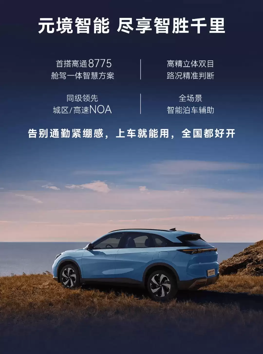 内饰布局基本延续现款设计,重点强化了科技配置与舒适性。15.6英寸中控屏与22.8英寸HUD抬头显示组成核心交互界面,支持CarPlay与HiCar手机互联功能。舒适性配置涵盖前排50W无线快充、座椅加热/通风/按摩功能,以及18扬声器音响系统。智能驾驶层面,全系标配L2级辅助驾驶功能,高配车型搭载高通8775舱驾一体芯片,可实现城区/高速NOA领航辅助及全场景智能泊车。