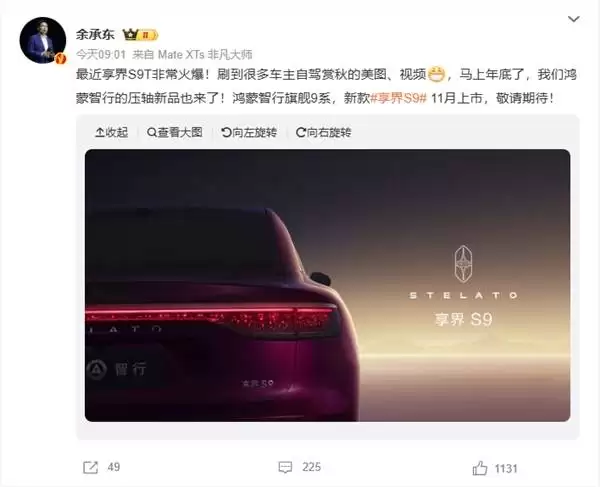 余承东宣布鸿蒙智行旗舰享界S9:11月登场,多项升级引期待