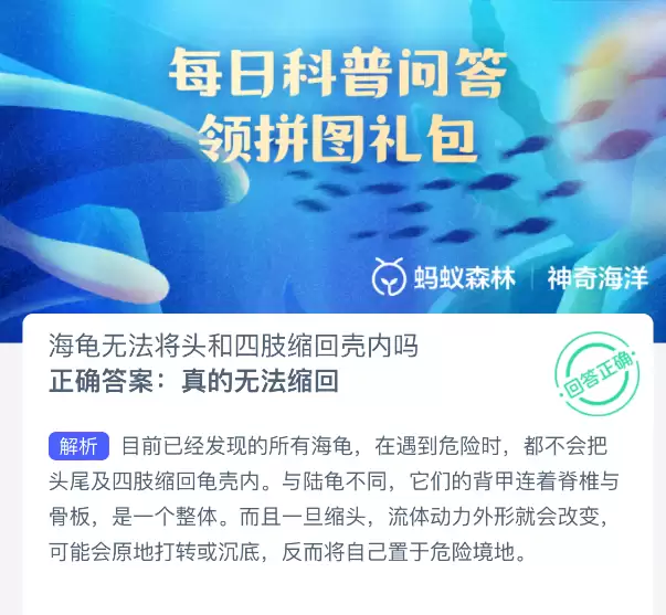 海龟真的不能把头缩进壳里吗?【神奇海洋】10月27日新题目已经开答!正确答案正式公布,点击领取拼图,一起为修复海洋生态贡献力量!今天的正确答案是:【确实无法缩回】。目前已知的所有海龟品种,在遇到危险时都无法将头尾和四肢缩回龟壳内部。