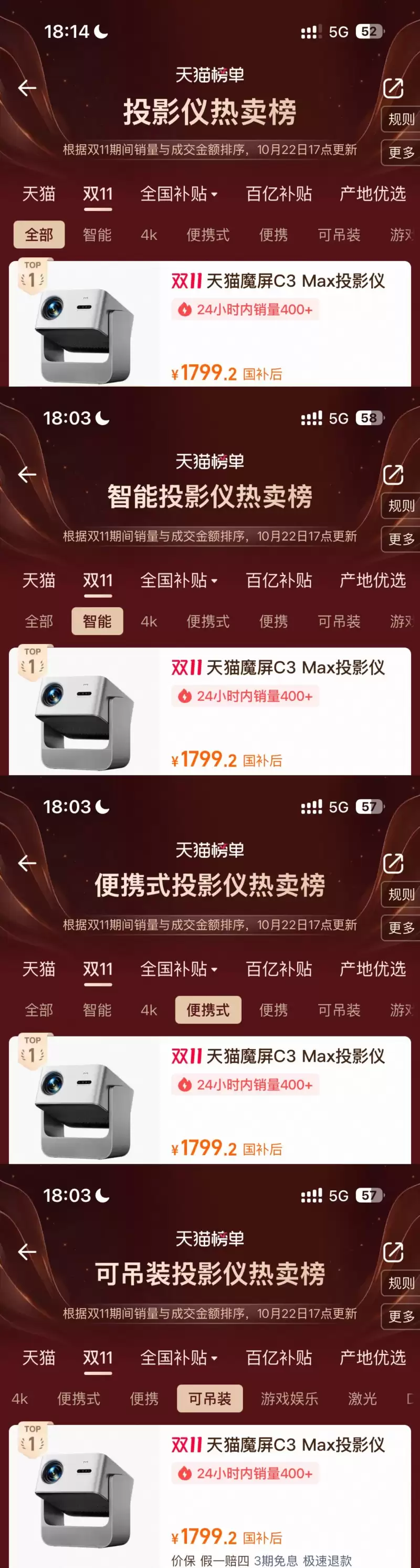 随着双十一进入白热化阶段,智能投影市场迎来历史性突破。天猫魔屏年度旗舰新品C3+Max自开售以来表现强势,凭借其颠覆性AI交互体验与越级性能配置,一举斩获天猫平台投影热销榜、智能榜及便携榜三大冠军,成为2025年双十一最具代表性的“千元投影之王”。