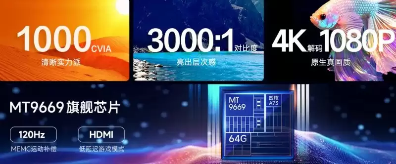 3.画质越级: 1000+ CVIA真实高亮搭配3000:1超高对比度,打破千元投影“见光死”魔咒;