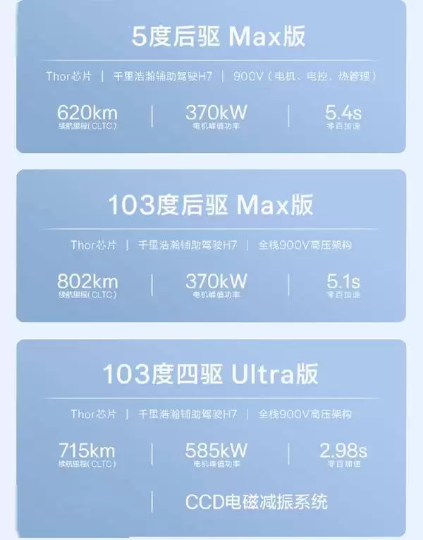 动力系统方面,三款车型呈现差异化布局。75度后驱Max版搭载75kWh神盾金砖电池,CLTC工况续航达620公里,配合370kW峰值功率电机,零百加速仅需5.4秒;103度后驱Max版升级至103kWh麒麟电池,续航提升至802公里,零百加速缩短至5.1秒;顶配四驱Ultra版采用双电机布局,综合功率高达585kW,零百加速仅2.98秒,最高车速可达255km/h,同时保持715公里CLTC续航能力。全系支持900V高压快充架构,使用V3液冷极充桩时,10分钟即可将电量从10%充至80%,补充续航最高570公里。
